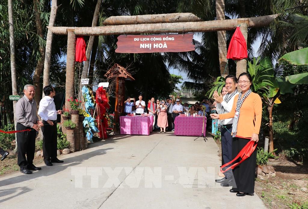 Bà Nguyễn Thị Quyên Thanh (đứng đầu hàng phải) và đại biểu thực hiện nghi thức ra mắt mô hình du lịch nông thôn Nhị Hòa. Ảnh: Thanh Hòa - TTXVN