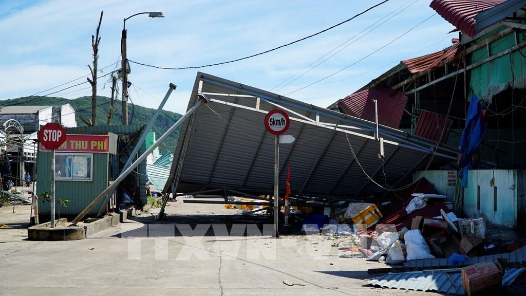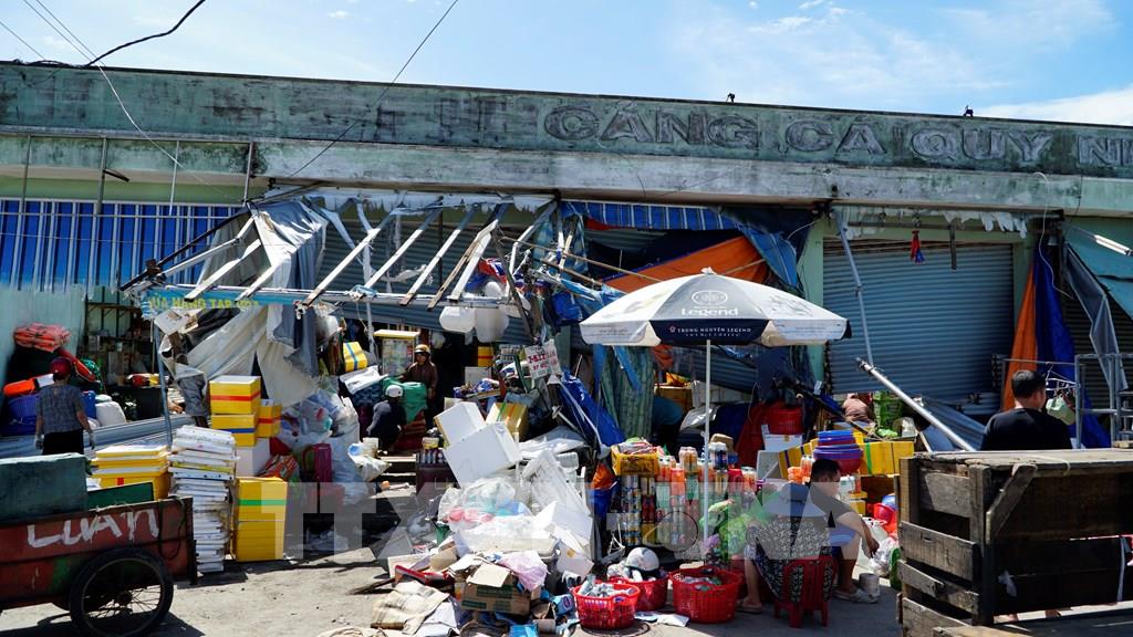 Toàn bộ ki ốt, cửa hàng tạp hóa tại cảng cá Quy Nhơn bị tốc mái, hư hỏng. Ảnh: Đình Quân-TTXVN