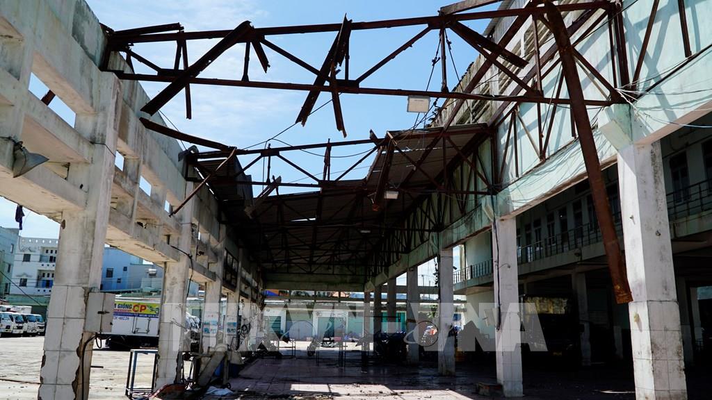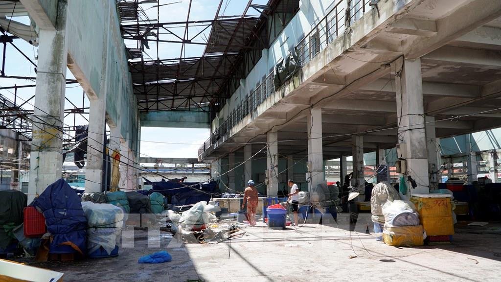 Nhà phân loại hải sản tại cảng cá Quy Nhơn bị tốc mái. Ảnh: Đình Quân-TTXVN