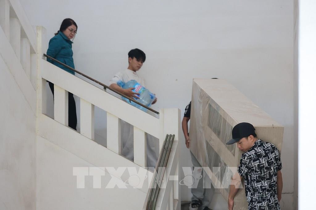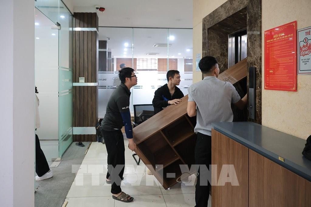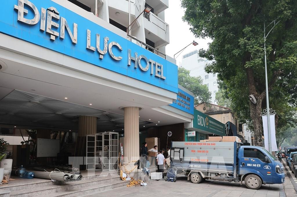 Đơn vị vận chuyển đang khẩn trương đóng gói, thu dọn vận chuyển đồ đạc tại Khách sạn Điện Lực 30 Lý Thái Tổ, phường Hoàn Kiếm. Ảnh: Lê Đông - TTXVN