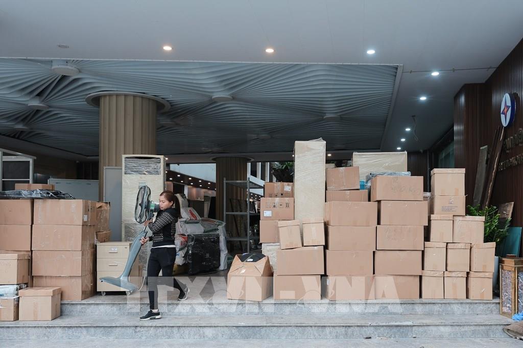 Đơn vị vận chuyển đang khẩn trương đóng gói, thu dọn vận chuyển đồ đạc tại Tổng công ty Điện lực thành phố Hà Nội 69 Đinh Tiên Hoàng, phường Hoàn Kiếm. Ảnh: Lê Đông - TTXVN