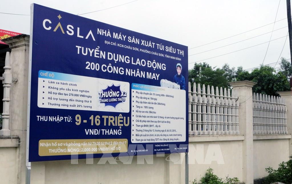 Thông báo tuyển lao động cùng nhiều chế độ ưu đãi thu hút lao động của Công ty cổ phần Casla tại Khu công nghiệp Châu Sơn, tỉnh Ninh Bình. Ảnh: Nguyễn Chinh - TTXVN