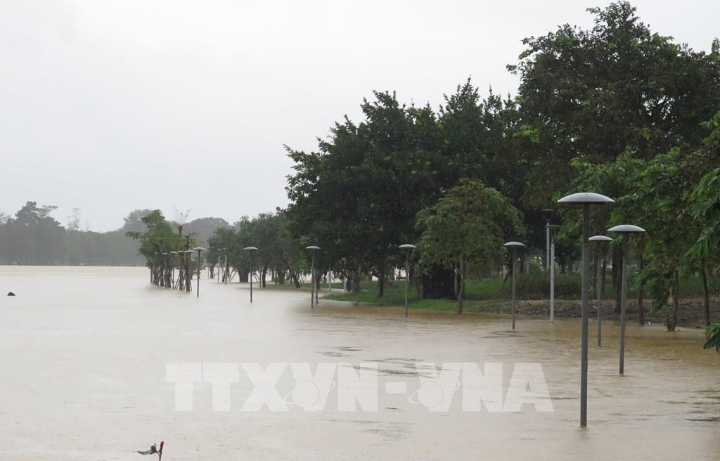 Đường đi bộ bờ Nam sông Hương, thành phố Huế bị ngập do lũ trên sông Hương dâng cao sáng 17/11. Ảnh: Nguyên Lý-TTXVN