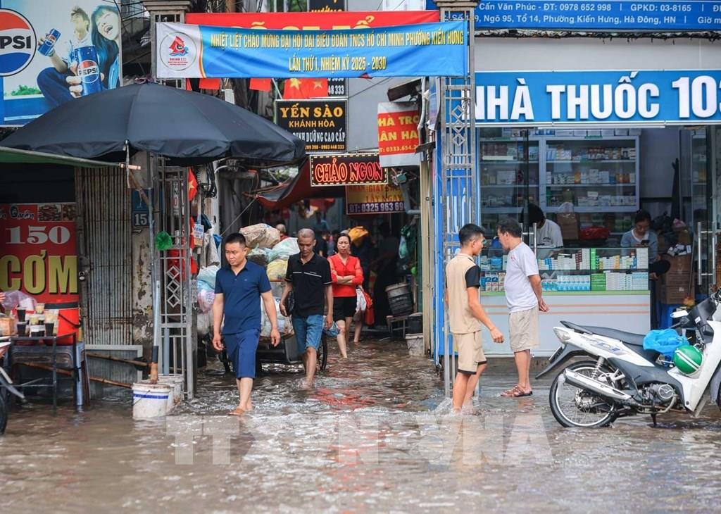 Chiều 7/10/2025, sau cơn mưa lớn kéo dài, nhiều tuyến đường của Hà Nội vẫn ngập sâu trong nước, gây khó khăn cho việc đi lại của người dân trong giờ tan tầm.
