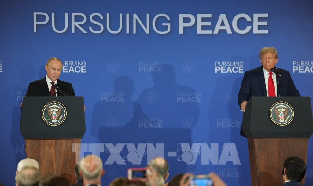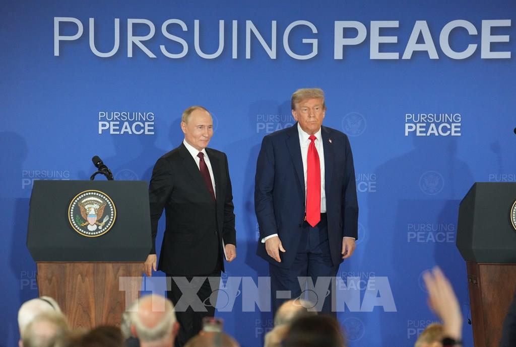 Tổng thống Mỹ Donald Trump (phải) và Tổng thống Nga Vladimir Putin trong cuộc họp báo chung tại Căn cứ Elmendorf-Richardson ở Anchorage, bang Alaska (Mỹ) ngày 15/8/2025. Ảnh: THX/TTXVN