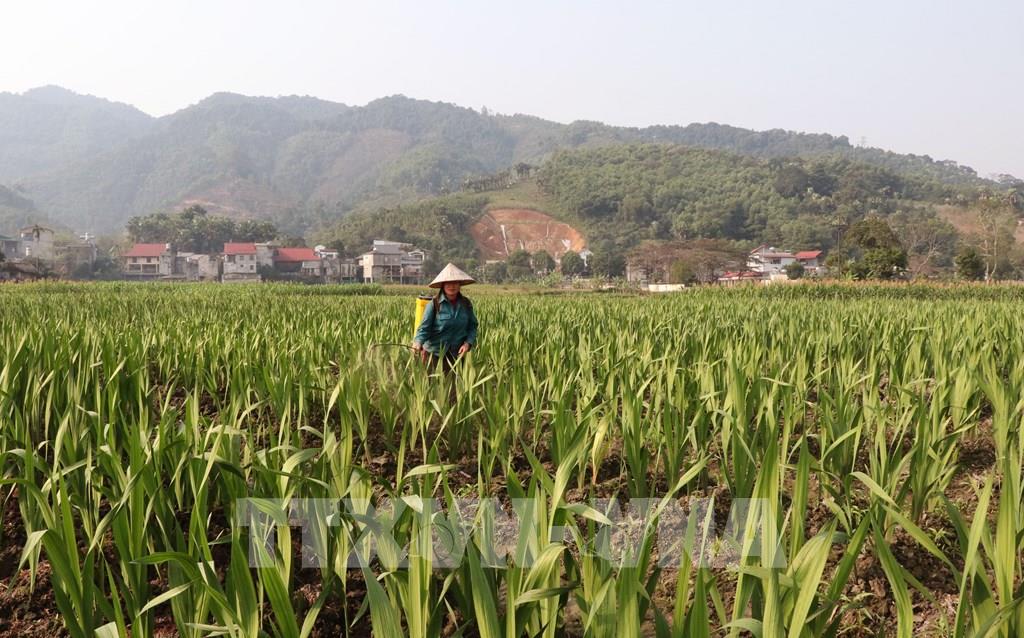 Người dân Vị Xuyên (Tuyên Quang) xuống đồng chăm sóc vựa hoa Tết. Ảnh: Đức Thọ - TTXVN
