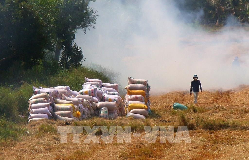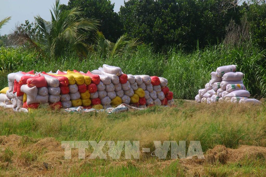 Lúa Đông Xuân 2025 – 2026 chất đống ngoài đồng tại xã Vị Thủy, thành phố Cần Thơ. Ảnh: Duy Khương - TTXVN