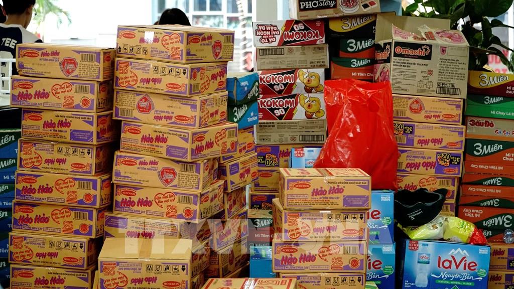 Thực phẩm thiết yếu như mì tôm, nước uống được nhiều người dân ủng hộ. Ảnh: Đình Quân-TTXVN