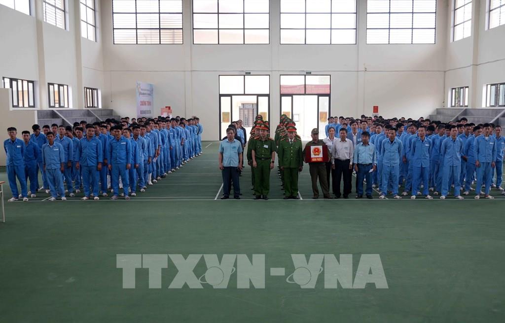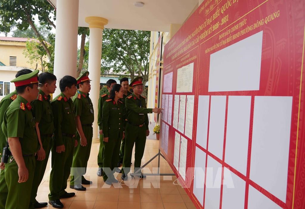 Cán bộ, chiến sĩ, học viên Cơ sở cai nghiện ma túy số 1 tỉnh Thanh Hóa thuộc Tổ bầu cử số 2, thôn Kim Sơn, xã Trung Chính thực hiện nghi thức khai mạc bầu cử tại đơn vị. Ảnh: Việt Hoàng - TTXVN