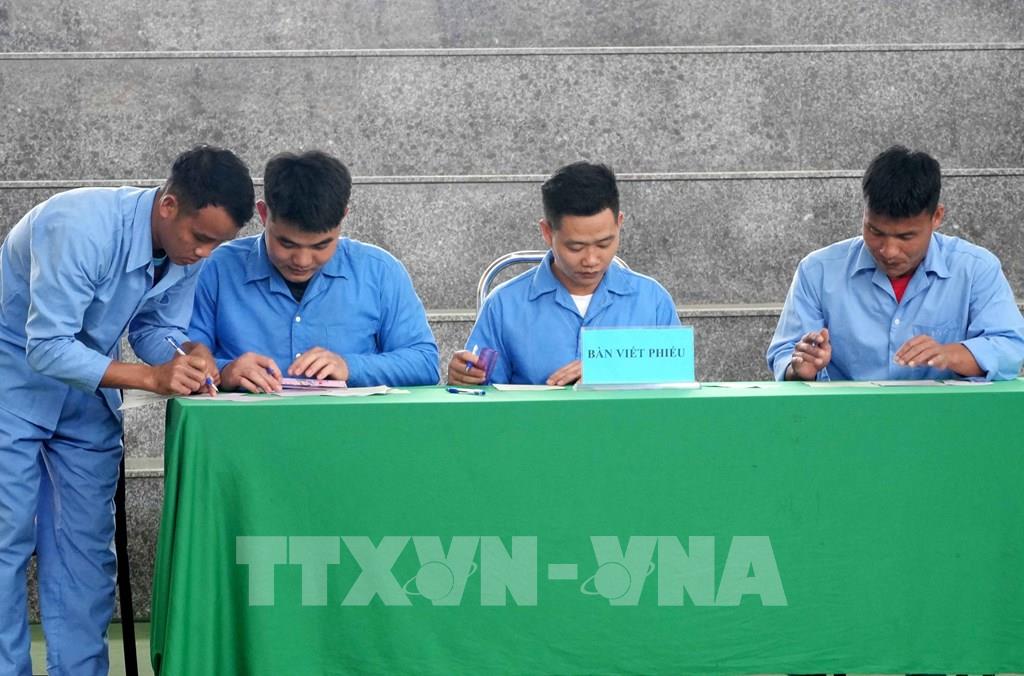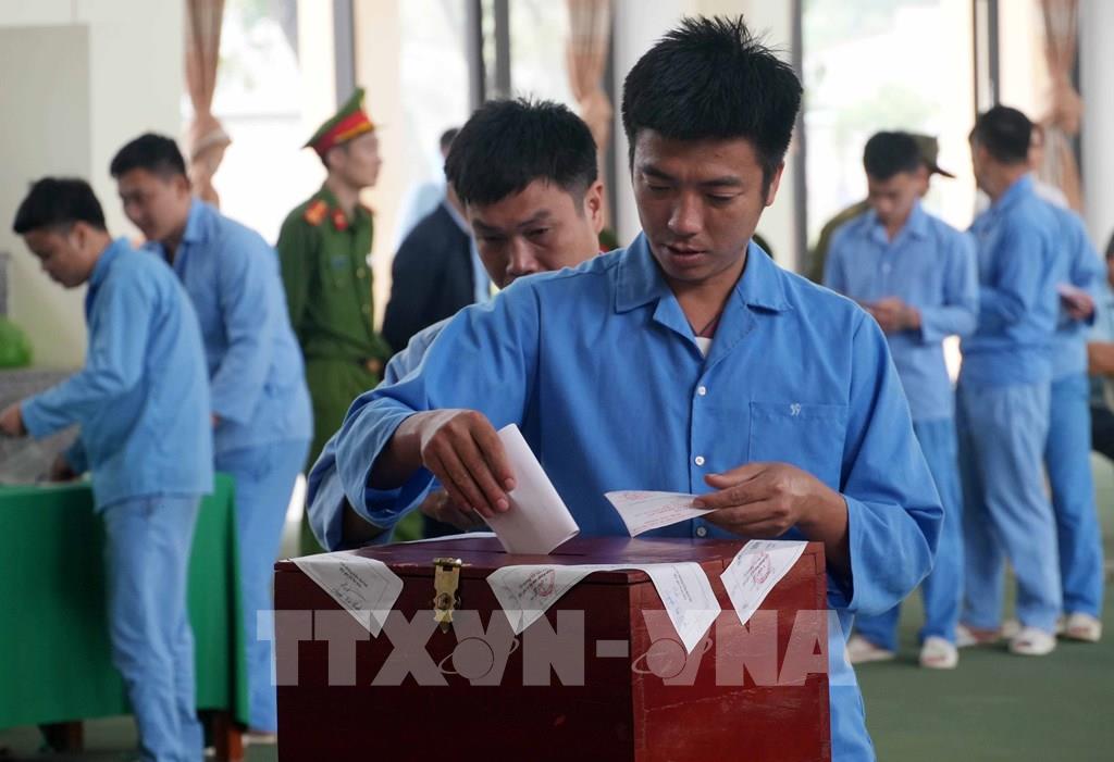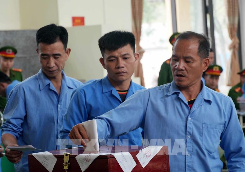 Các cử tri tại Cơ sở cai nghiện ma túy số 1 tỉnh Thanh Hóa thuộc Tổ bầu cử số 2, thôn Kim Sơn, xã Trung Chính bỏ phiếu bầu cử. Ảnh: Việt Hoàng - TTXVN