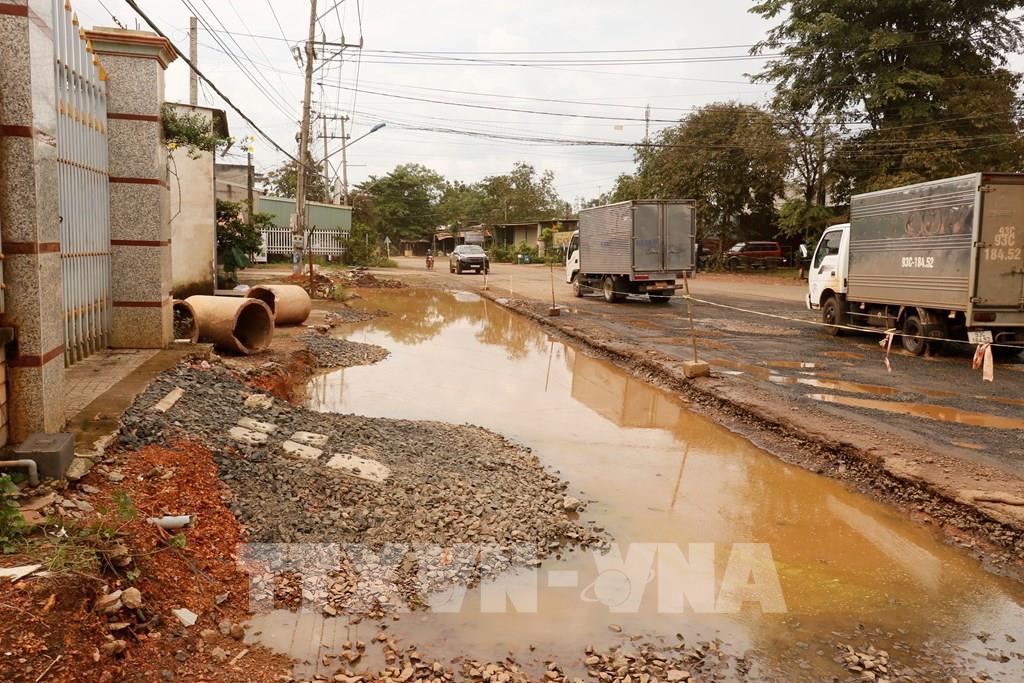 Dự án nâng cấp, mở rộng đường ĐT 753 thi công chậm, nước mưa đọng tràn vào lòng đường. Ảnh: K GỬIH-TTXVN