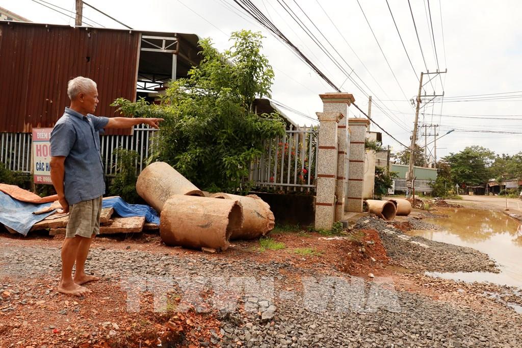 Dự án nâng cấp, mở rộng đường ĐT 753 bị đọng nước trước cổng nhà gây khó khăn người dân đi lại. Ảnh: K GỬIH-TTXVN