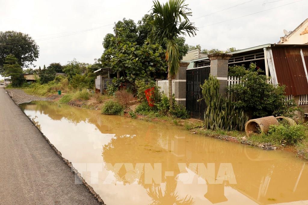 Dự án nâng cấp, mở rộng đường ĐT 753 gây nước đọng trước cổng nhà người dân. Ảnh: K GỬIH-TTXVN