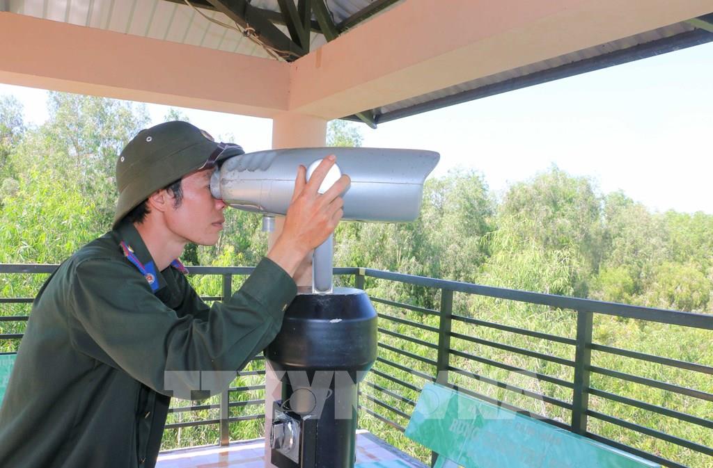 Anh Nguyễn Thái Trọng, cán bộ chuyên trách bảo vệ rừng tràm Trà Sư (thuộc Trạm Quản lý rừng số 3, Ban Quản lý rừng An Giang – Khu vực II) kiểm tra phân khu bảo vệ nghiêm ngặt trong Khu bảo vệ cảnh quan rừng tràm Trà Sư bằng ống nhòm chuyên dụng. Ảnh: Công Mạo-TTXVN
