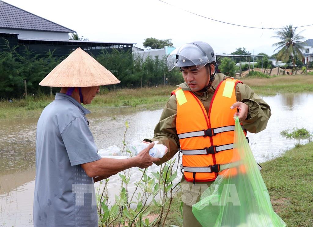 Công an xã Phước Dinh mang thức ăn, nước uống đến phát cho người dân vùng rốn lũ thôn An Thạnh. Ảnh: Công Thử - TTXVN