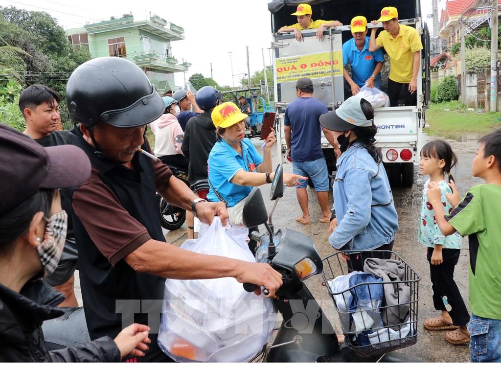 Một doanh nghiệp ở phường Bảo An thực hiện chuyến hàng “quà 0 đồng” đưa nhu yếu phẩm đến phát cho người dân vùng lũ xã Ninh Phước. Ảnh: Công Thử - TTXVN