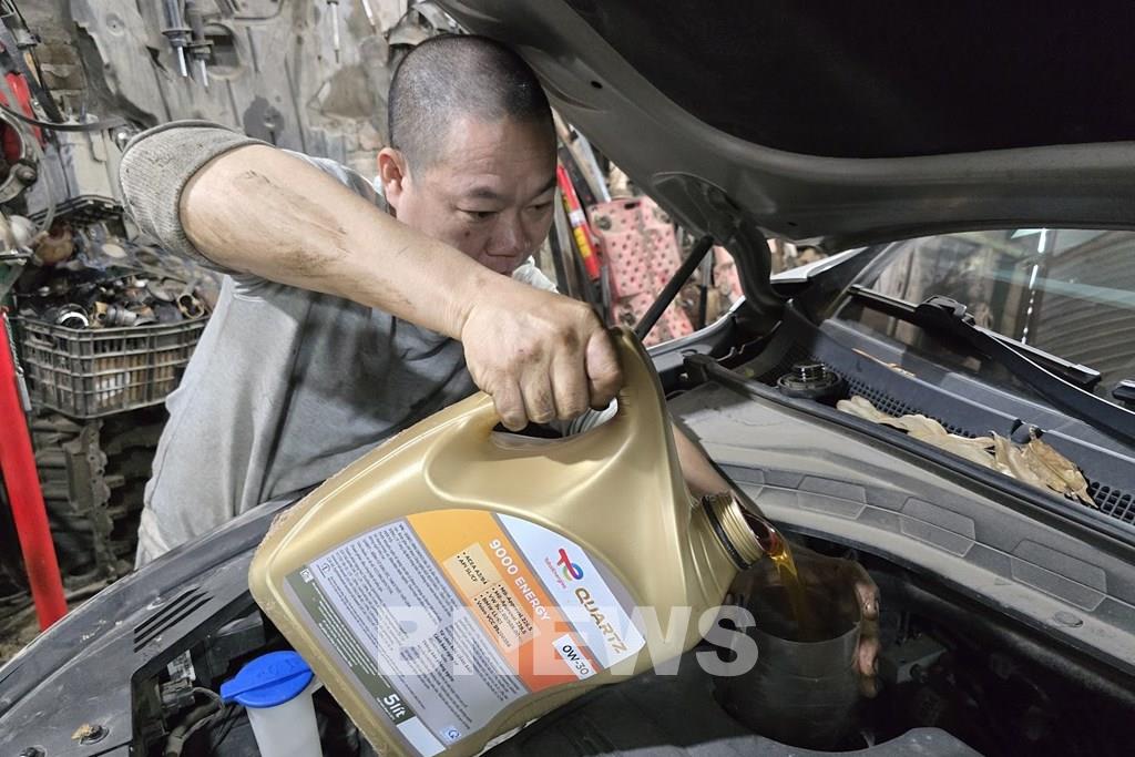 Thay dầu ô tô định kỳ theo km (thường 5.000 km) hoặc thời gian (6-12 tháng). Nên dùng dầu tổng hợp. Việc này giúp dầu bôi trơn, làm mát động cơ, kéo dài tuổi thọ và giữ giá trị xe. Ảnh: Văn Xuyên/BNEWS/TTXVN