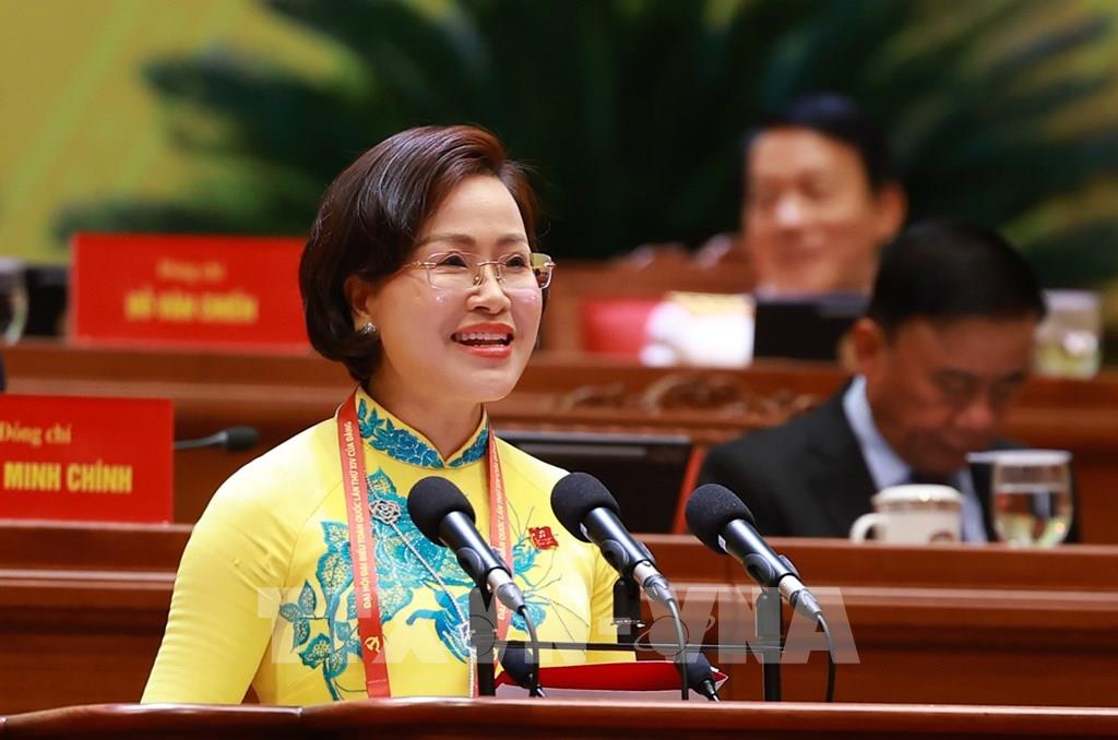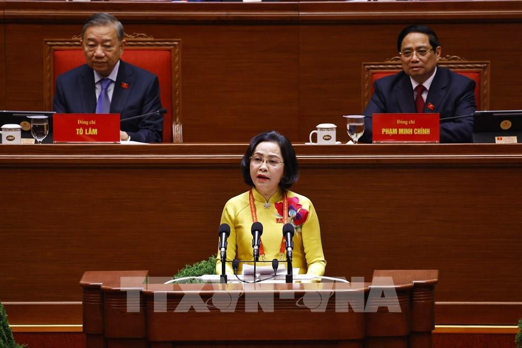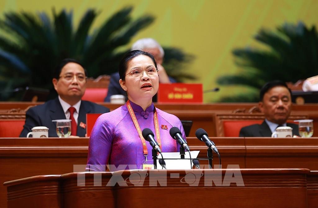 Đồng chí Hà Thị Nga, Ủy viên Trung ương Đảng, Phó Bí thư Thường trực Đảng ủy Mặt trận Tổ quốc, các đoàn thể Trung ương, Phó Chủ tịch, Tổng Thư ký Ủy ban Trung ương Mặt trận Tổ quốc Việt Nam, tham luận về vấn đề “Phát huy sức mạnh đoàn kết toàn dân tộc – nền tảng và động lực quan trọng thực hiện thắng lợi các mục tiêu phát triển đất nước trong kỷ nguyên mới”. Ảnh: TTXVN