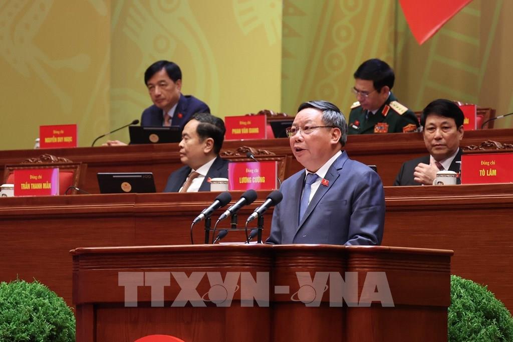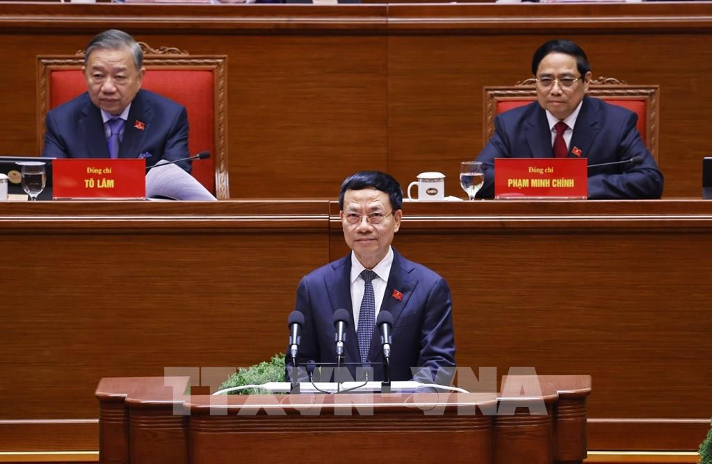 Đồng chí Nguyễn Mạnh Hùng, Ủy viên Trung ương Đảng, Bí thư Đảng ủy, Bộ trưởng Bộ Khoa học và Công nghệ, tham luận về vấn đề “Giải pháp đột phá phát triển khoa học công nghệ, đổi mới sáng tạo và chuyển đổi số quốc gia trở thành động lực chính xác lập mô hình tăng trưởng mới và phát triển bền vững quốc gia”. Ảnh: TTXVN
