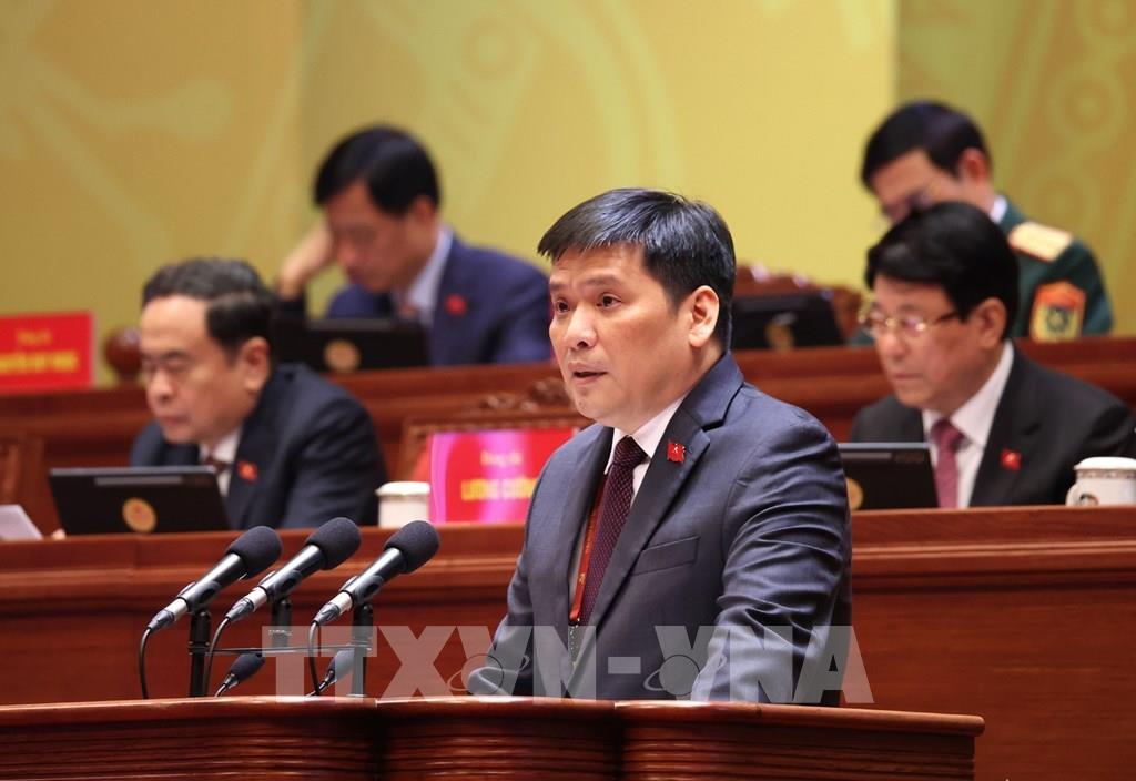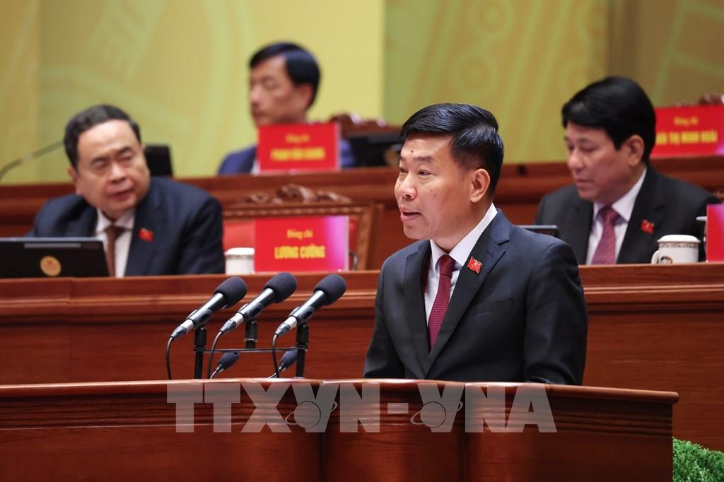 Đồng chí Nguyễn Văn Phong, Phó Bí thư Thường trực Thành ủy Hà Nội, tham luận về vấn đề “Đổi mới phương thức lãnh đạo của Đảng bộ thành phố Hà Nội đáp ứng yêu cầu phát triển trong kỷ nguyên mới, góp phần kiến tạo tương lai phát triển của đất nước”. Ảnh: TTXVN