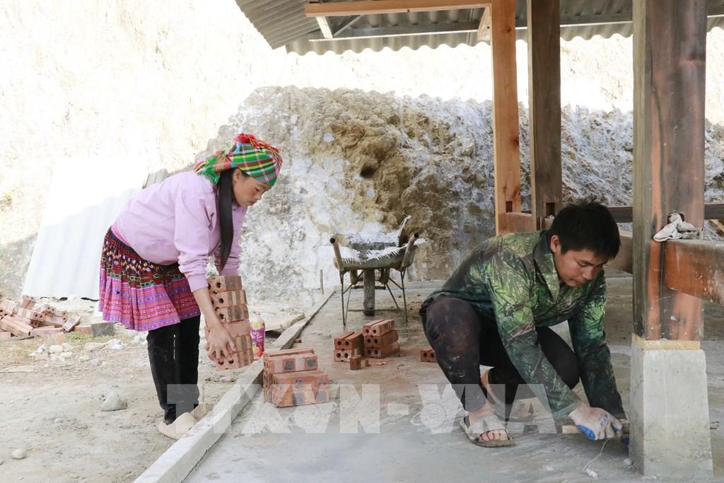 Vợ chồng anh Thào Thành Sinh, thôn Làng Sang, xã Púng Luông (Lào Cai) nỗ lực hoàn thành ngôi nhà để kịp đón Tết. Ảnh: Tuấn Anh - TTXVN