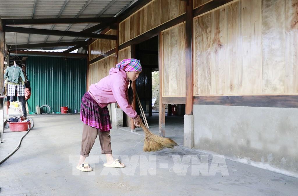 Chị Vàng Thị Mai, thôn Làng Sang, xã Púng Luông (Lào Cai) phấn khởi dọn nhà cửa khi năm nay cả gia đình được đón Tết trong căn nhà mới. Ảnh: Tuấn Anh - TTXVN