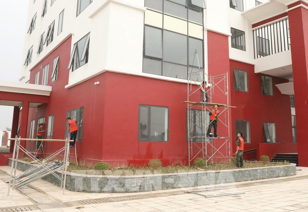 Công nhân hoàn tất công việc tại khu Nhà hiệu bộ của Trường Đại học Hoa Lư, chuẩn bị cho lễ khánh thành trường. Ảnh: Đức Phương - TTXVN