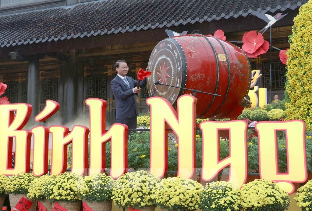 Ủy viên Trung ương Đảng, Bí thư Tỉnh ủy Ninh Bình Đặng Xuân Phong gióng trống khai hội. Ảnh: Thùy Dung - TTXVN