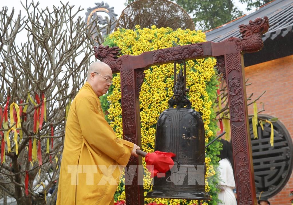 Hòa thượng Thích Thanh Nhiễu, Phó Chủ tịch Thường trực Hội đồng Trị sự Giáo hội Phật giáo Việt Nam, Trụ trì chùa Bái Đính thỉnh chuông khai hội. Ảnh: Thùy Dung - TTXVN