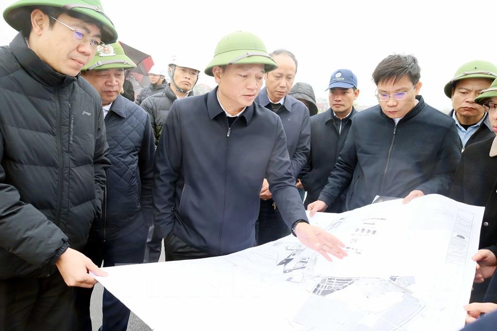 Đoàn công tác kiểm tra thực tế triển khai Dự án đường song hành vành đai 5. Ảnh: Nguyễn Chinh – TTXVN