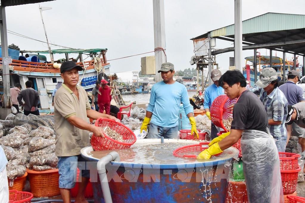 Lao động làm việc tại Cảng cá Định An (xã Đại An, tỉnh Vĩnh Long), điểm kiểm soát quan trọng trong thực hiện các giải pháp gỡ “thẻ vàng” IUU. Ảnh: Thanh Hòa- TTXVN