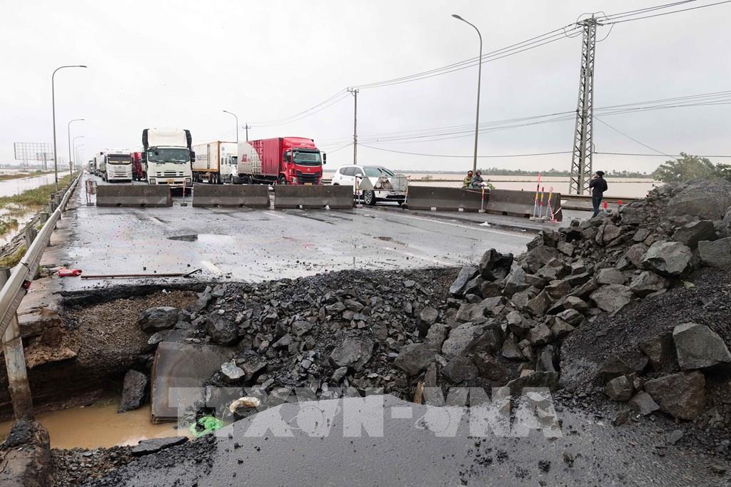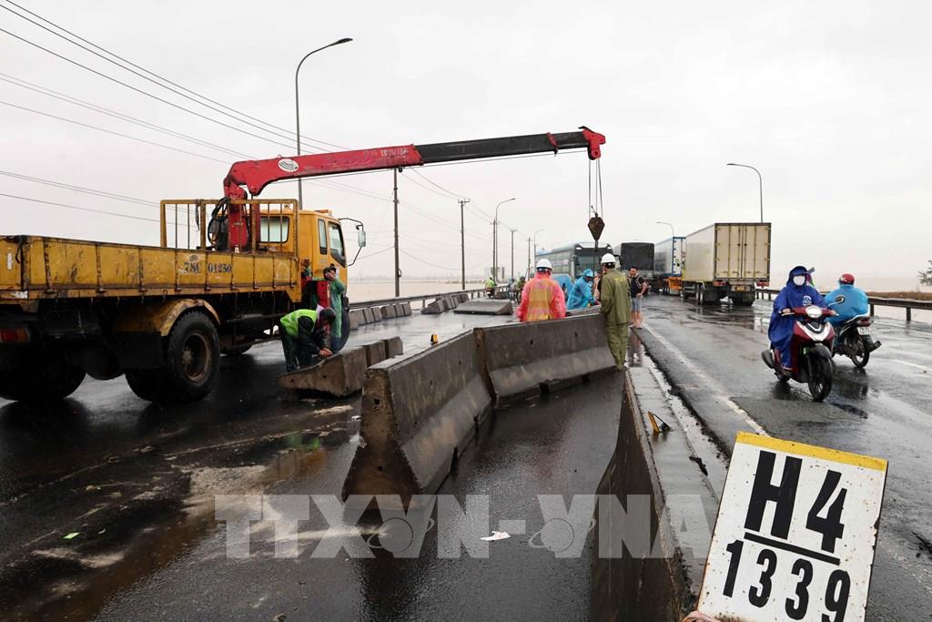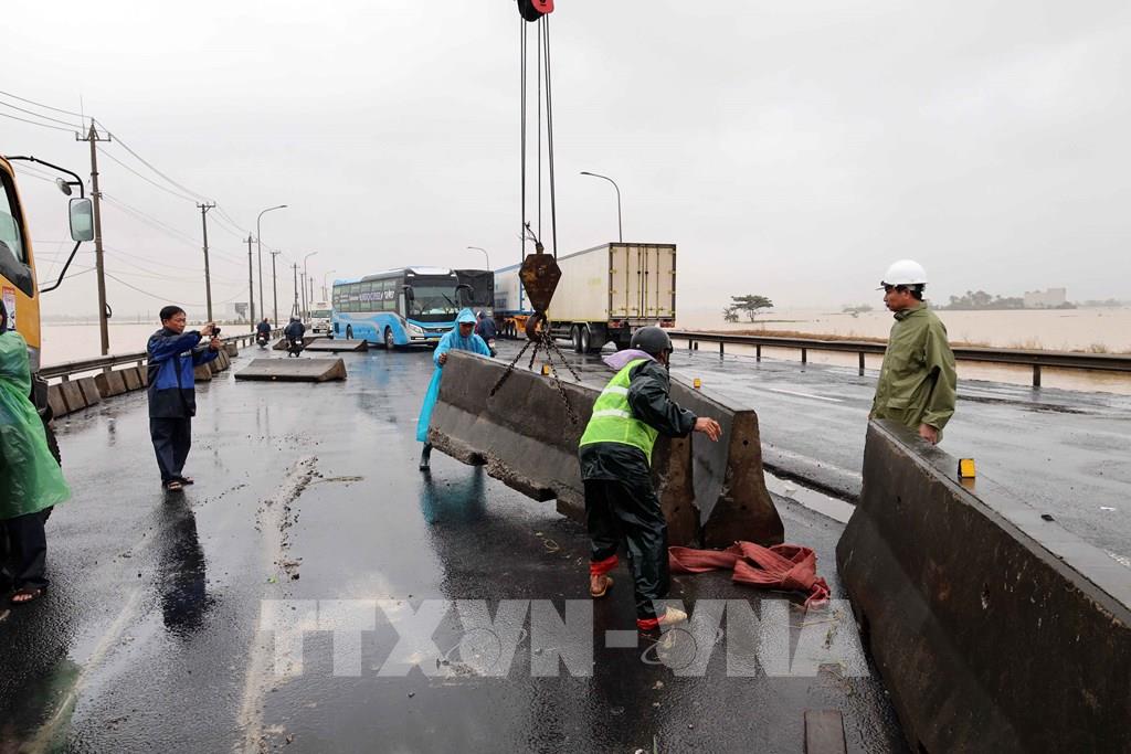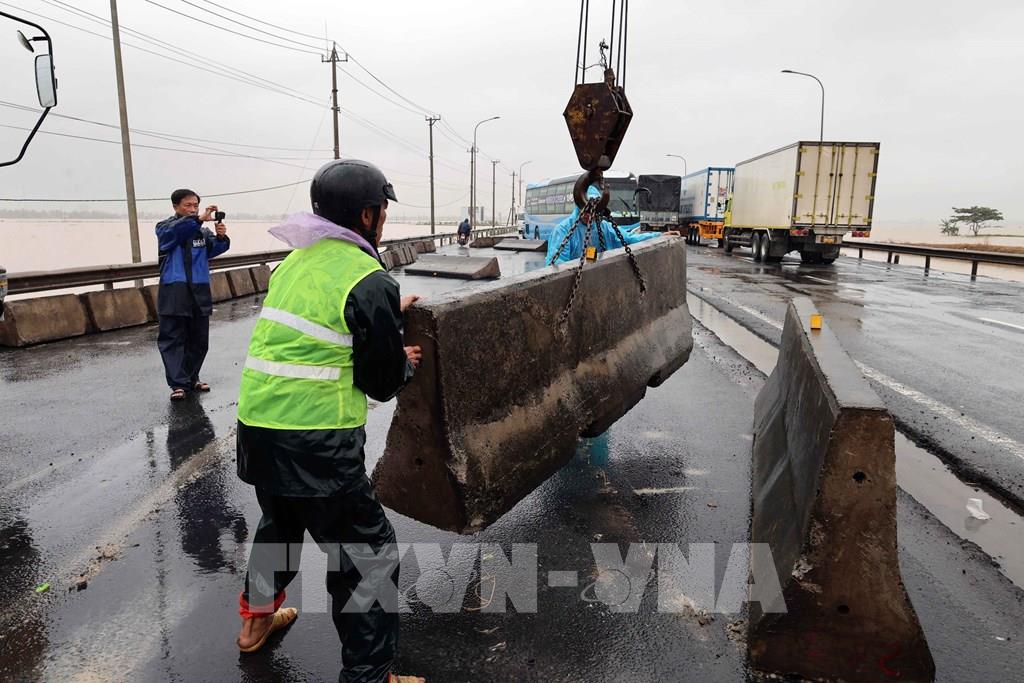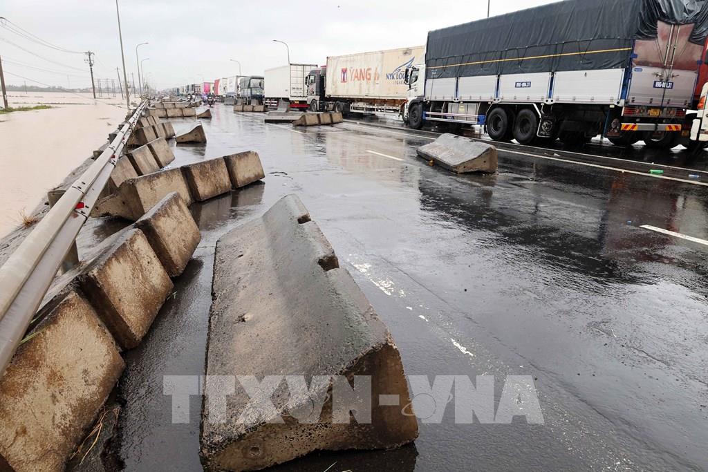 Nỗ lực khắc phục giải phân cách cứng bị trôi dạt trên Quốc lộ 1A. Ảnh: Đỗ Trưởng - TTXVN