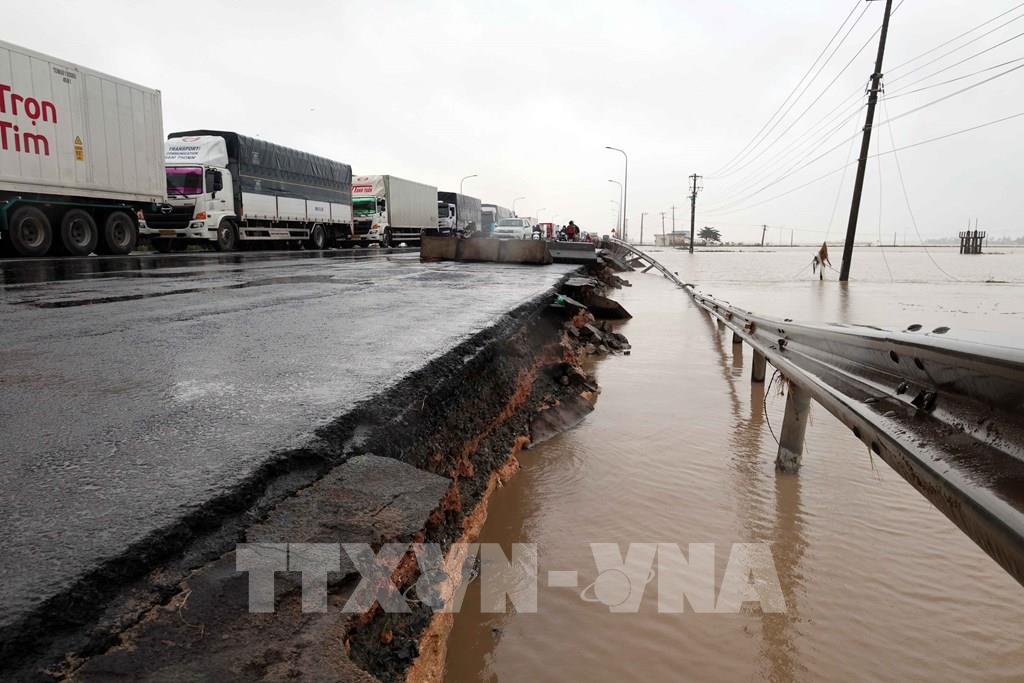 Quốc lộ 1A qua địa bàn phường Phú Yên (Đắk Lắk) có vị trí bị xói lở nghiêm trọng, ảnh hưởng đến việc đi lại của các phương tiện. Ảnh: Đỗ Trưởng – TTXVN