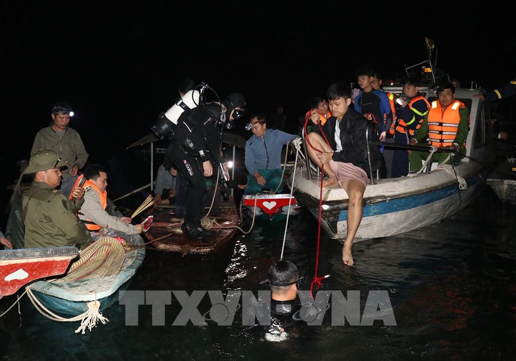 Đội thợ lặn nỗ lực tìm kiếm thi thể nạn nhân. Ảnh: Đinh Thùy - TTXVN