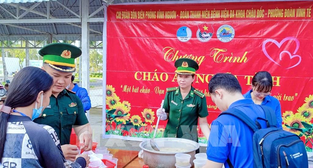Cán bộ, chiến sĩ Đồn Biên phòng Vĩnh Nguơn (Ban chỉ huy Bộ đội Biên phòng tỉnh An Giang) trao những bát cháo nóng hổi, thơm phức đến tận tay người bệnh và người nhà bệnh nhân nghèo đang điều trị tại Bệnh viện Đa khoa Châu Đốc, tỉnh An Giang. Ảnh: Công Mạo-TTXVN