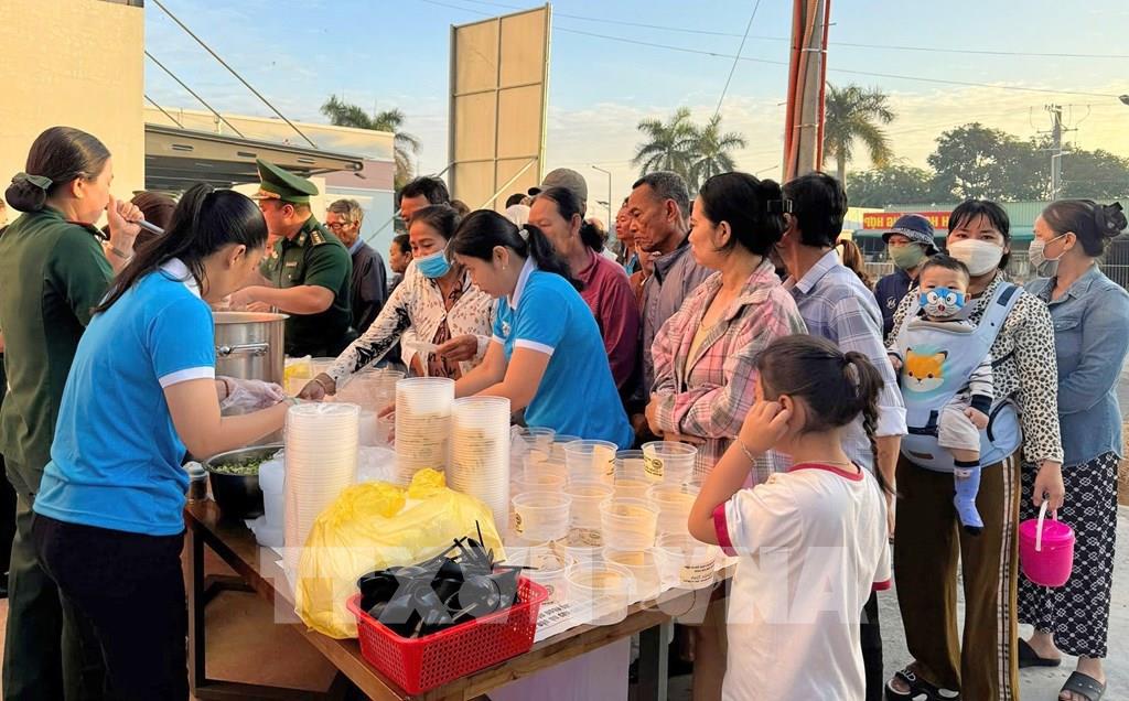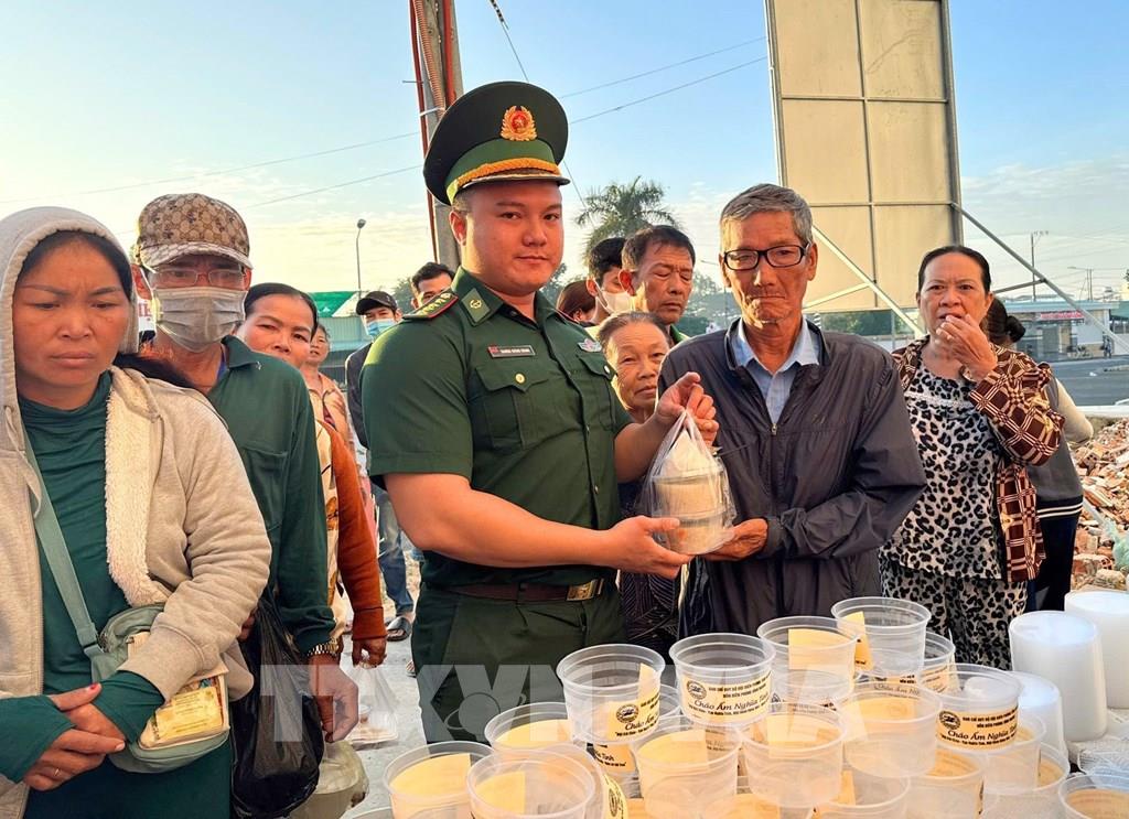 Chương trình “Cháo ấm nghĩa tình” được chỉ huy Đồn Biên phòng Vĩnh Nguơn (Ban chỉ huy Bộ đội Biên phòng tỉnh An Giang) triển khai từ đầu năm 2025. Ảnh: Công Mạo-TTXVN