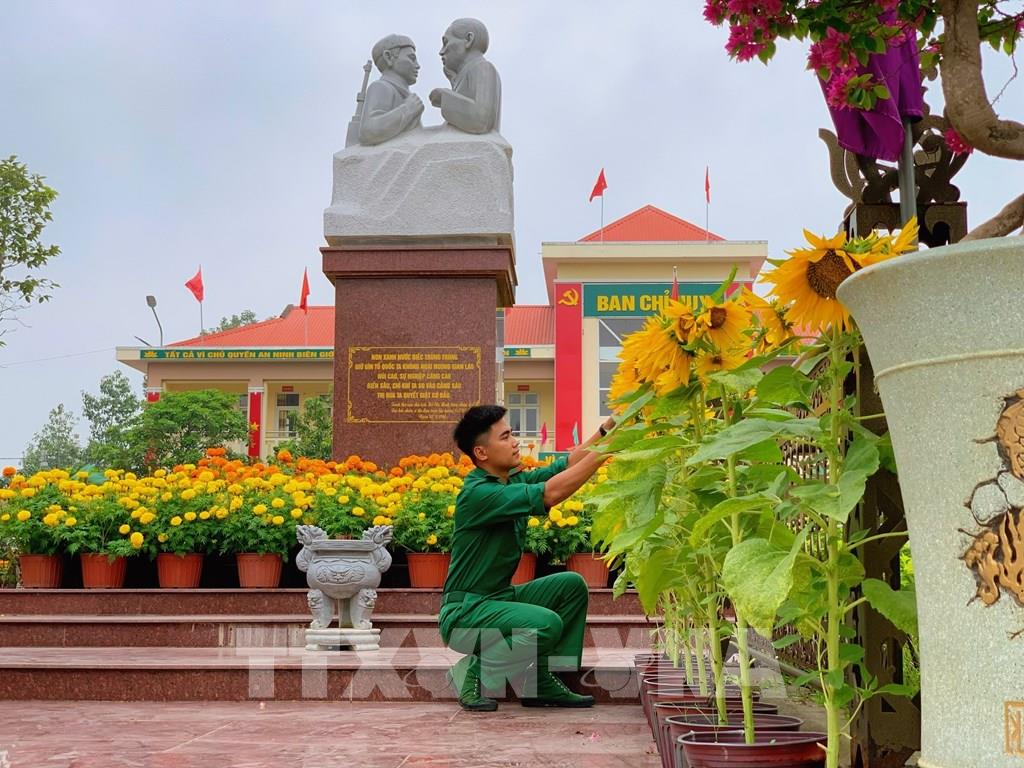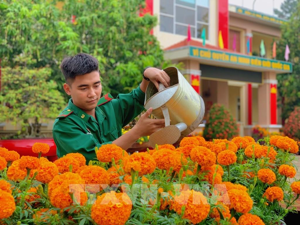 Chiến sĩ chăm sóc từng khóm hoa tại Đồn biên phòng Cửa khẩu Mỹ Quý Tây (xã Mỹ Quý, Tây Ninh) để mùa Xuân rực rỡ hơn. Ảnh: Bùi Giang - TTXVN