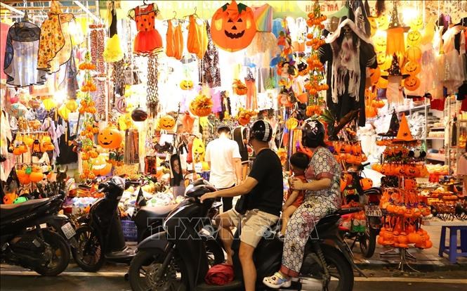 Trên nhiều tuyến phố, các mặt hàng trang trí và đồ chơi dịp Halloween được bày bán đa dạng. Ảnh: TTXVN