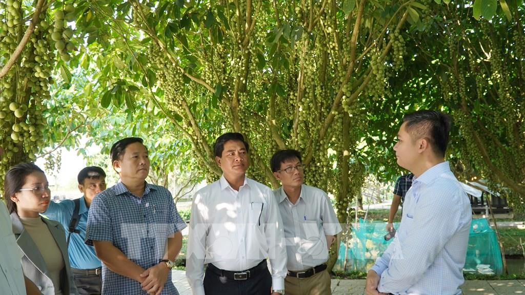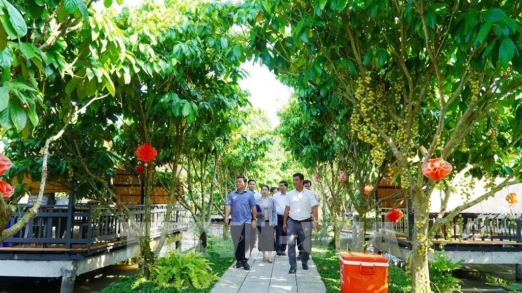 Đoàn tham quan, tìm hiểu mô hình trồng dâu hết hợp du lịch tại Vườn sinh thái Mê Linh Gia (xã Thạnh Lộc, An Giang). Ảnh: Văn Sĩ - TTXVN