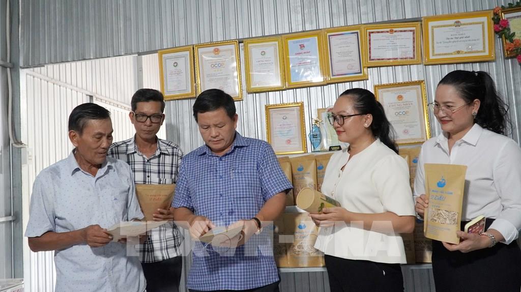 Đoàn tham quan, tìm hiểu hoạt động của Hợp tác xã nông nghiệp Đường Gỗ Lộ (xã Long Thạnh, An Giang). Ảnh: Văn Sĩ - TTXVN