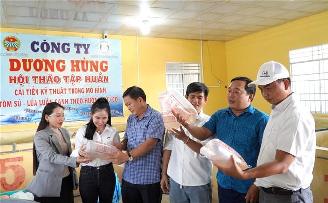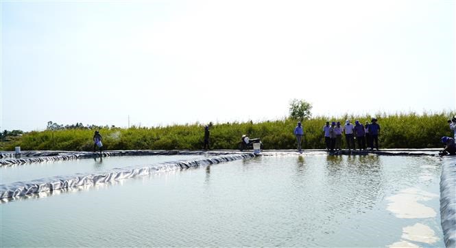 Đoàn tham quan, tìm hiểu về sản xuất cung ứng tôm giống tại chi nhánh Công ty TNHH Giống Thủy Sản Dương Hùng (xã Tân Thạnh, An Giang). Ảnh: Văn Sĩ - TTXVN
