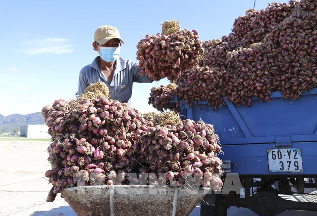 Người dân xã Thanh Hải (Ninh Hải, Ninh Thuận) vận chuyển hành tím đưa đi tiêu thụ. Ảnh: Nguyễn Thành – TTXVN