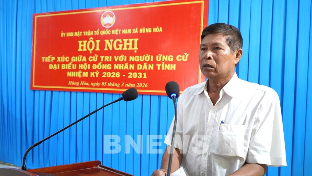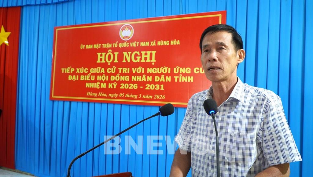 Cử tri xã Hùng Hòa phát biểu ý kiến tại hội hội nghị tiếp xúc cử tri với ứng cử viên Đại biểu HĐND tỉnh nhiệm kỳ 2026-2031. Ảnh: Thanh Hòa-TTXVN