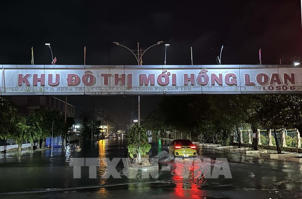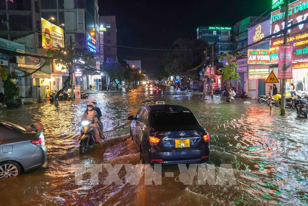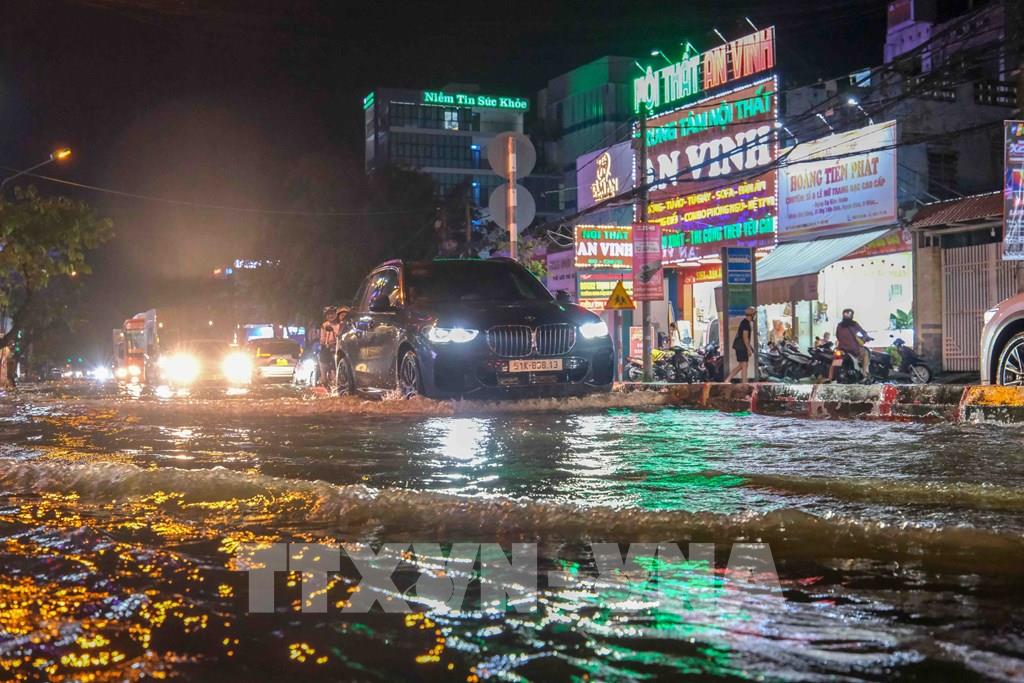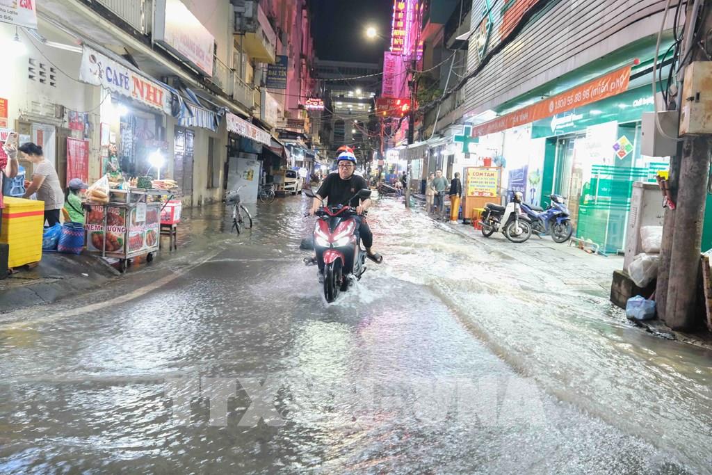 Nước ngập tràn lên vỉa hè đường Cách Mạng Tháng Tám tối 24/10. Ảnh: Thanh Liêm - TTXVN
