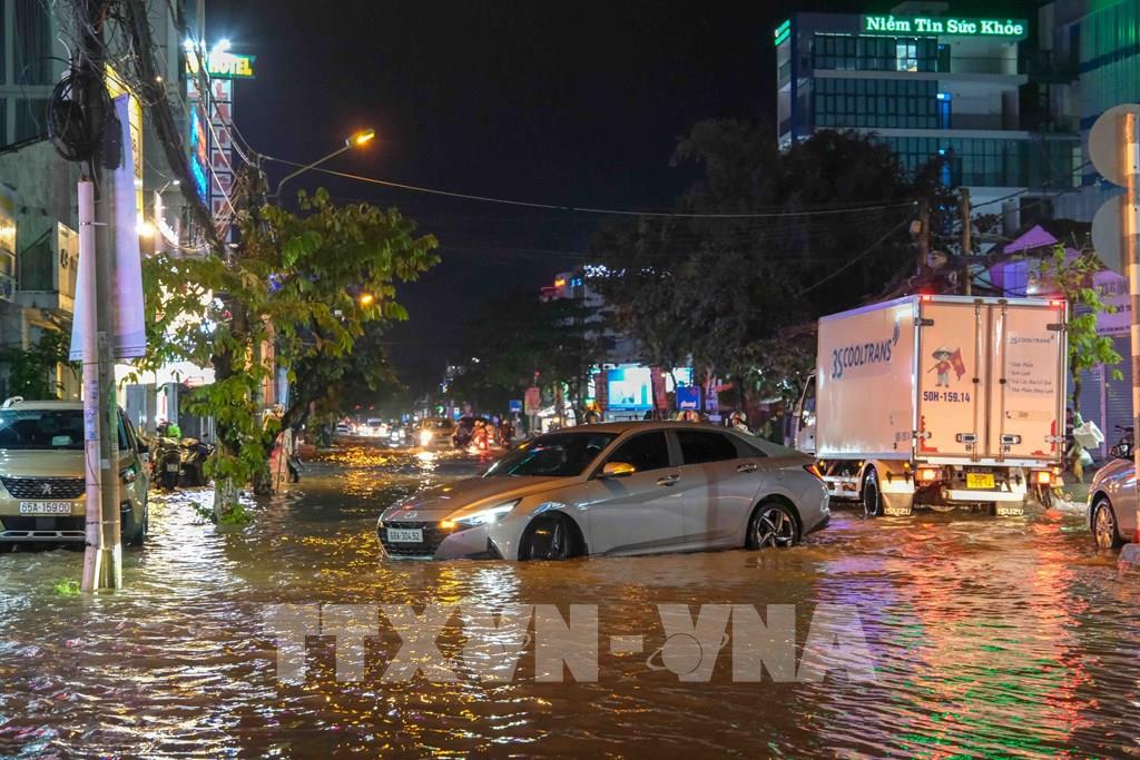 Đường Cách Mạng Tháng Tám khi triều cường vượt báo động III tối 24/10. Ảnh: Thanh Liêm - TTXVN