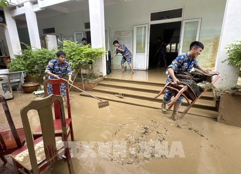 Sau khi nước rút, lực lượng quân đội đóng chân trên địa bàn tỉnh Khánh Hòa hỗ trợ khắc phục hậu quả do mưa lũ ở trường học. Ảnh: Phan Sáu - TTXVN