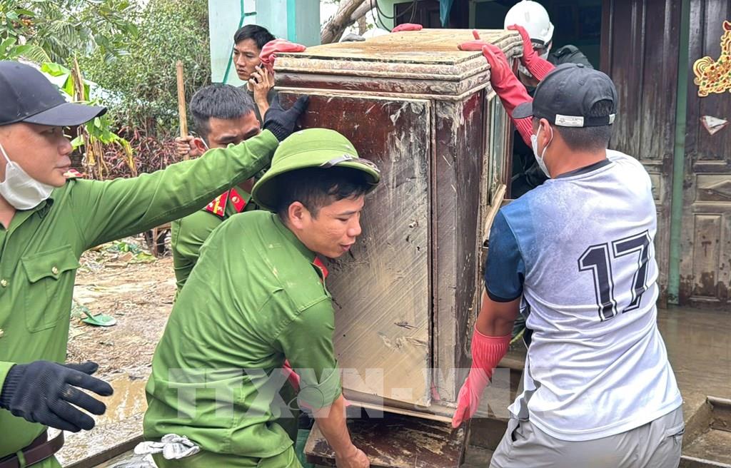 Cán bộ, chiến sỹ Công an tỉnh Đắk Lắk giúp người dân dọn dẹp đồ đạc bị hư hỏng do mưa lũ. Ảnh: Tường Quân - TTXVN
