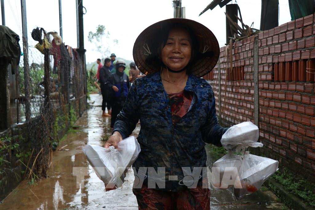 Những suất cơm nóng đã được trao tới tay người dân vùng lũ. Ảnh: Tuấn Anh - TTXVN
