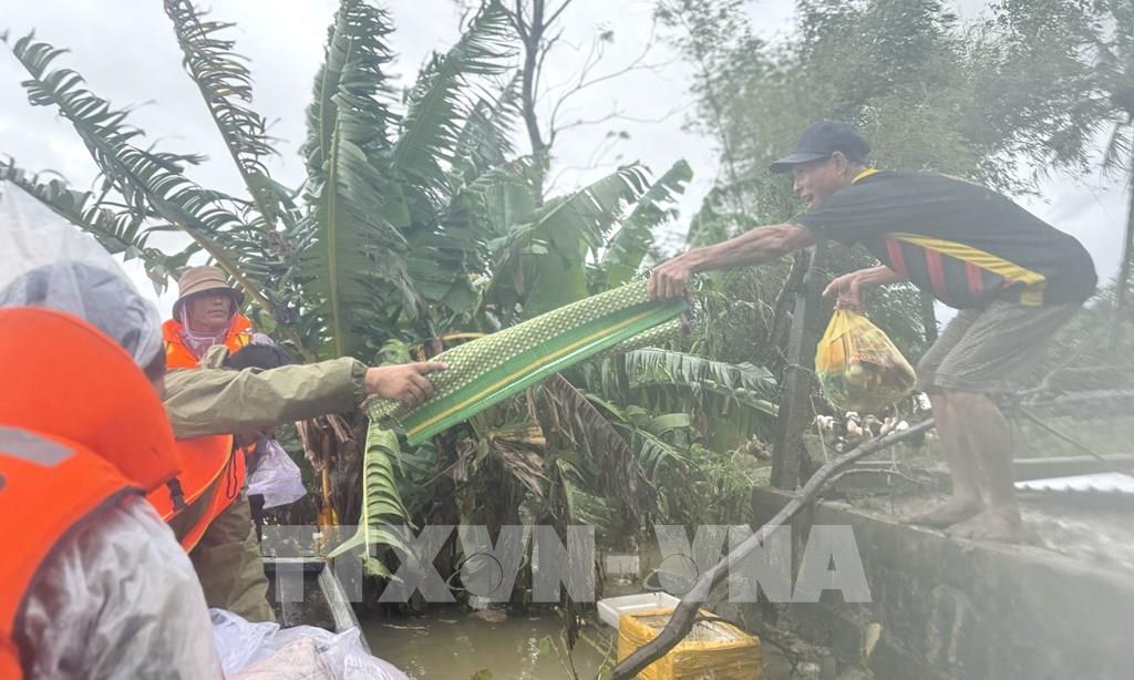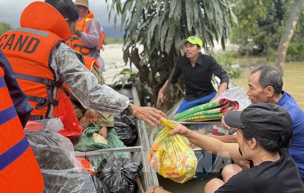 Lực lượng chức năng cung cấp lương thực, nước uống cho người dân vùng tâm lũ xã Hoà Thịnh. Ảnh: Tường Quân - TTXVN