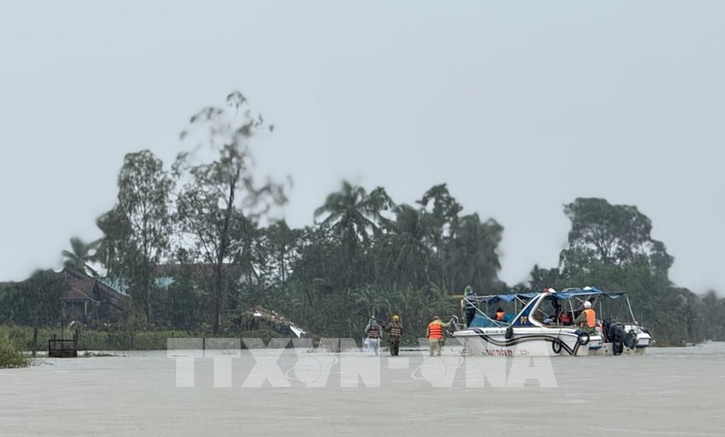 Ca nô tiếp cận người dân vùng lũ cung cấp lương thực, nhu yếu phẩm cho người dân. Ảnh: Tường Quân - TTXVN